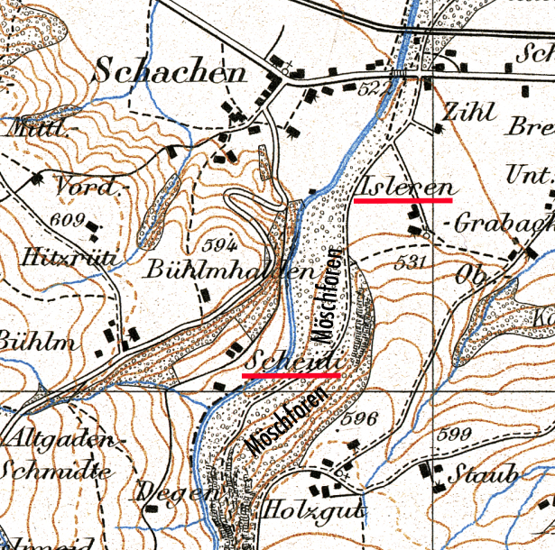 Bei meiner Arbeit an der SGTK bin ich auf Hinweise zu einem Eisenbergbau in der Nähe von Malters gestossen. In den Jahren 1594 und 1596 müssen bei Malters zwei Versuche zur Verhüttung von Eisen gestartet worden sein. 1594 wurden neben einem Schmelzofen, Knappenhäuser und andere Gebäude errichtet (Schmiede usw.). Als dann die Anlagen zum grössten Teil fertiggestellt waren, wurden sie bei einem Unwetter durch den hochgehenden Rümlig zerstört. Zwei Jahre später erinnerte man sich wieder an die bei Malters entdeckten Eisenerze und gründete 1596 die Malteser Bergwerksgemeinschaft. Man erstellte ein neues Hüttenwerk, aber dieses Mal wurden bei den Installationen auch Wuhrbauten am Rümlig erwähnt. Man hatte also aus der vorhergegangenen Katastrophe gelernt und versuchte den Fluss in seine Schranken zu verweisen. Das Hüttenwerk soll oberhalb der Schachenbrücke in der Möschforen am Rümlig erstellt worden sein. Dann heisst es wieder, der Ort soll noch heute Isleren heissen. Auch der Fluhrnamen Scheidi könnte auf eine Eisenverarbeitung deuten. Also müsste das Werk irgendwo zwischen Scheidi und Isleren, oberhalb der Brücke erstellt worden sein (Walter 1923).