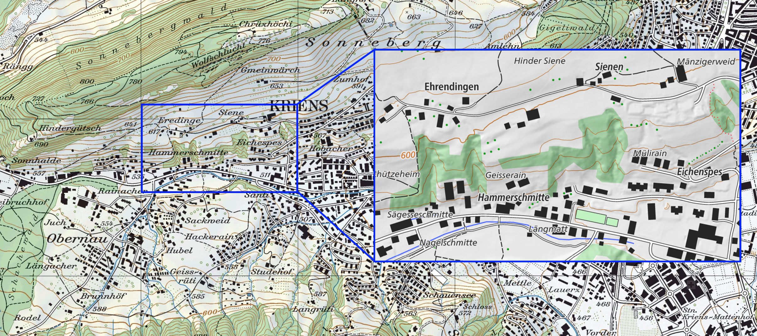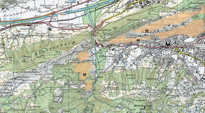 Aber wo müsste man den überhaupt das Eisenerz von Malters suchen? Wir befinden uns hier bekanntlich in der Molasse und es sind mir in dieser Gegend ausser bei Kriens keine weiteren Eisenbergwerke bekannt. Schauen wir doch einmal hinüber nach Kriens. Wir haben hier so viele schriftliche Zeugnisse von einem Eisenbergbau in der Molasse und immer werden zwei Flurnamen genannt: Mühlerain und Menzigerweid.