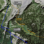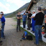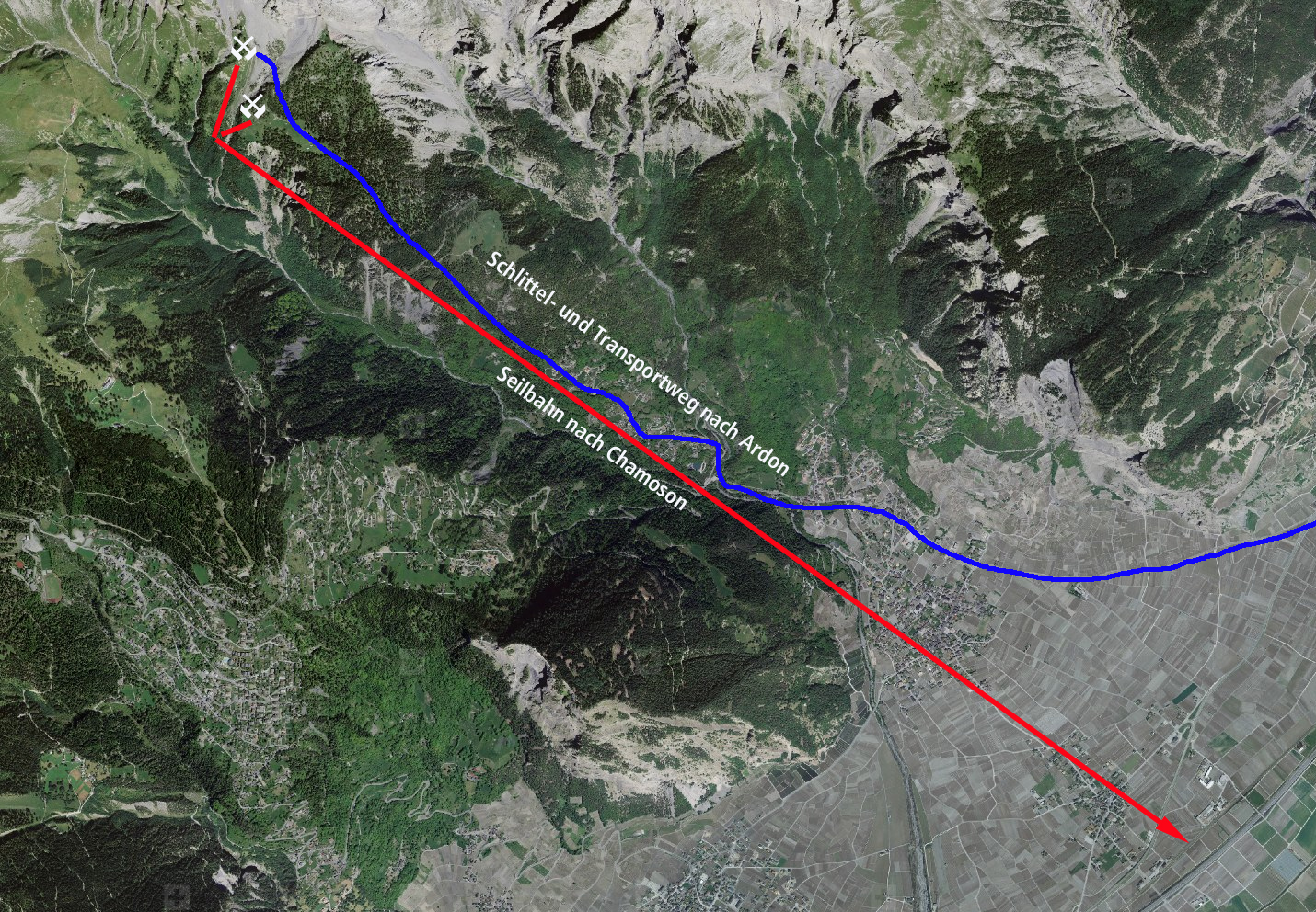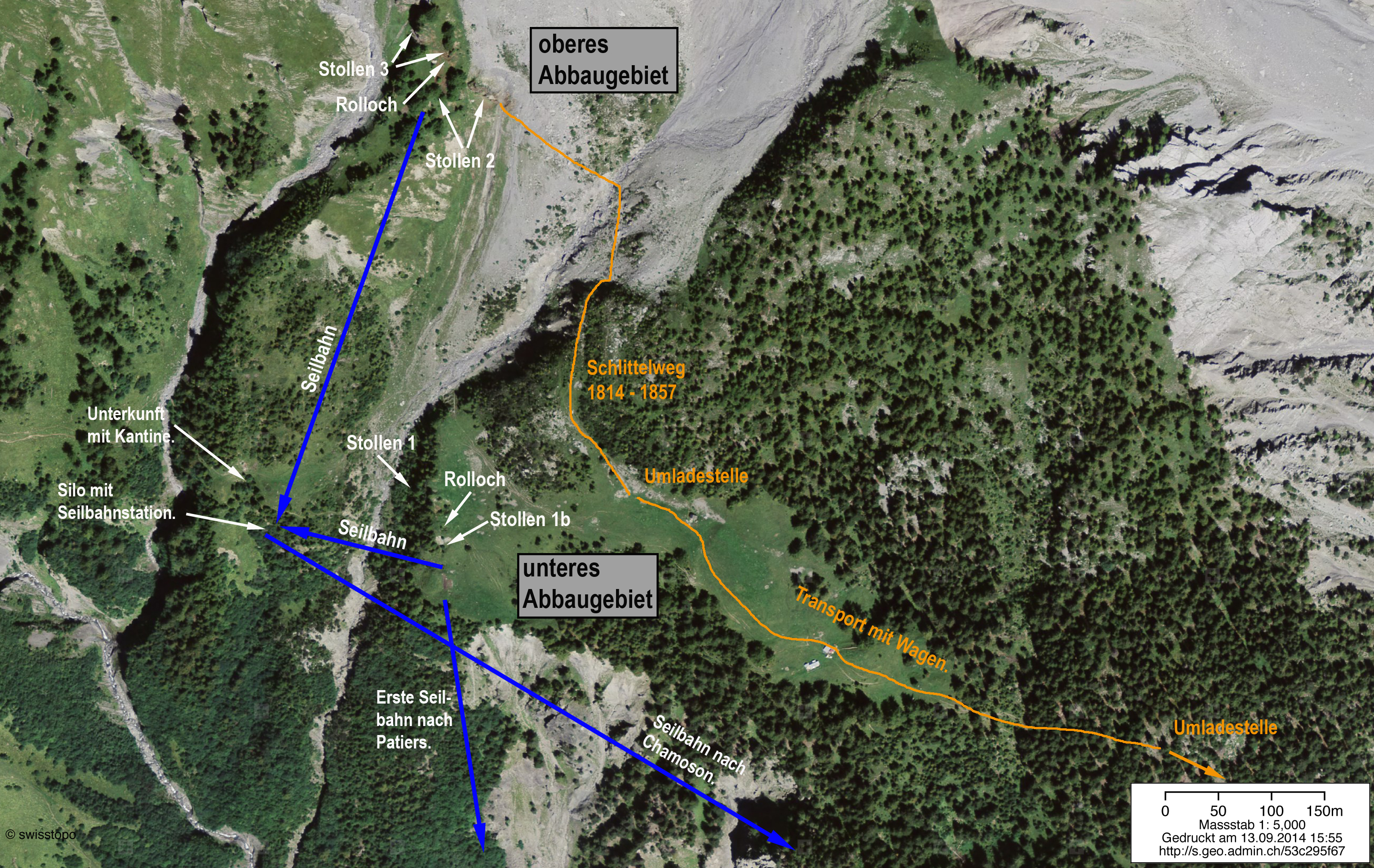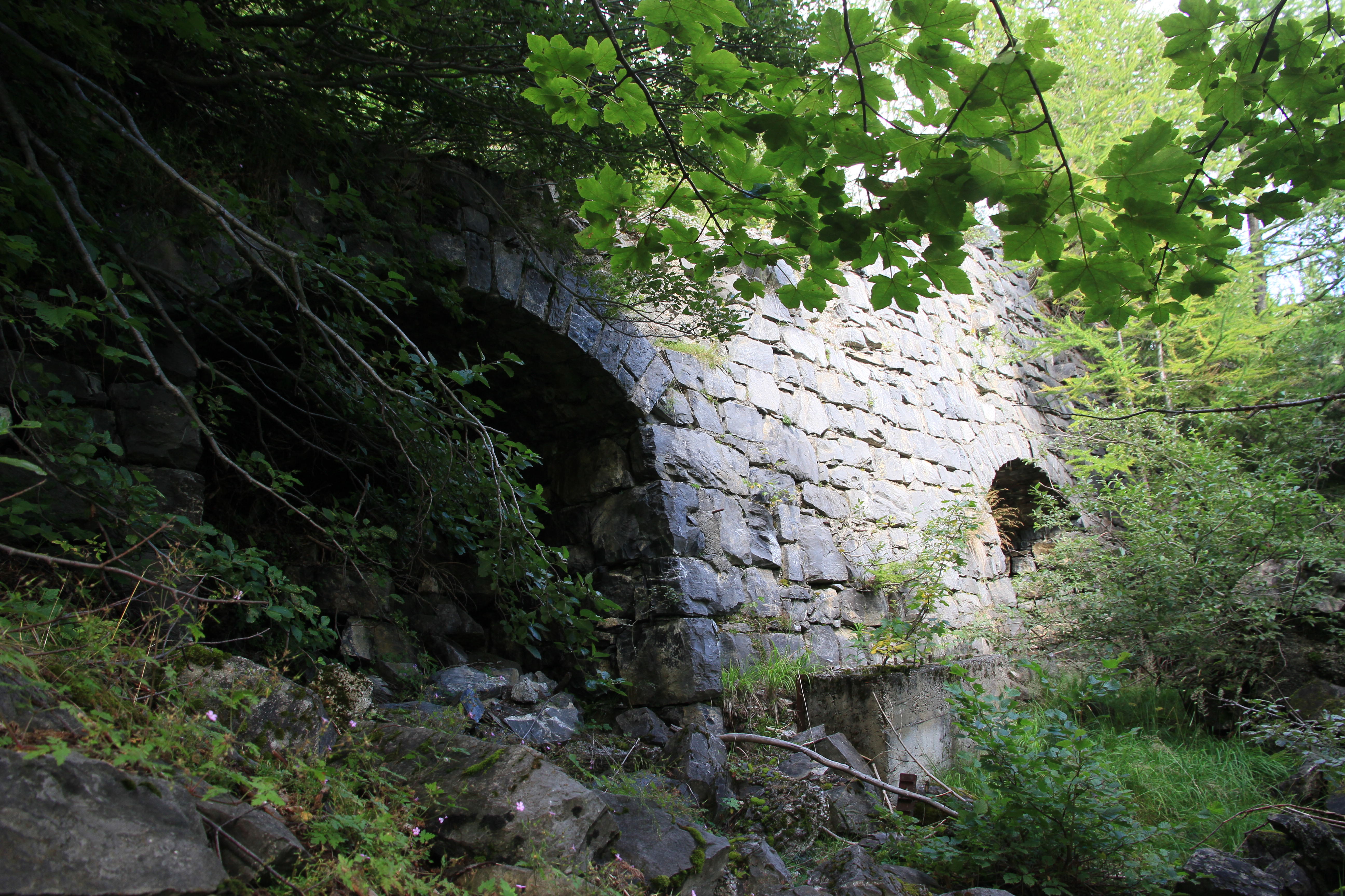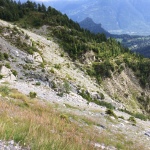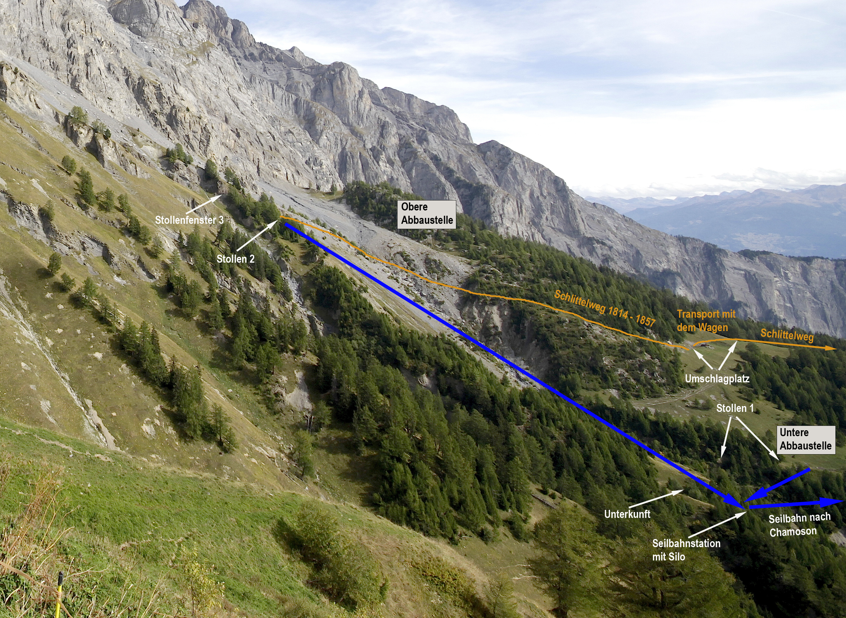 Wie in der Ausschreibung angekündigt, war der Stollen III nicht sonderlich gross. Nach einer kurzen Erholungsphase machten sich die Teilnehmer individuell an die Erforschung des Stollens. Während die einen noch fleissig im Stollen am fotografieren waren, machte sich der Rest der Gruppe auf den Rückweg. Es mussten immerhin nochmals je 200 Höhenmeter zurückgelegt werden. Wie sich bei Gesprächen beim Picknick herausgestellt hatte, hatte Roger die Lage der Wohnbaracke mit der Lage der Seilbahnstation verwechselt. Ein Teil der Gruppe wollte auf dem Rückweg natürlich noch einen kleinen Abstecher zur Seilbahnstation mit den Silos unternehmen….und ich muss sagen, es hatte sich gelohnt. Zwischen dicht gewachsenem Gestrüpp entdeckten wir das Gewicht des Seilspanners, die Mauern der Silos und einige noch sichtbaren Fundamente der alten Anlage. Aber trotz der Faszination dieser Entdeckungen durften wir nicht die Zeit vergessen, wir wollten doch zusammen mit den Anderen wieder beim Ausgangspunkt unserer Exkursion ankommen. Wir warfen noch einen letzten Blick auf die alten Gemäuer und staunten darüber, was hier oben alles an Infrastrukturen aufgebaut worden war, ohne das ein Abbau stattgefunden hatte. Wieder bei der Alp Chamosentse angekommen, mussten alle zuerst ein wenig zu Atem kommen und wie zur Belohnung für unsere Anstrengungen verzogen sich auch noch die letzten Nebelschleier vor dem Haut de Cry. Vor uns tat sich ein faszinierendes Panorama mit Blick auf die eindrücklichen Falten der Morcles-Decke auf. Wir genossen zum Abschluss den Anblick in der herrlichen Abendsonne. Das an diesem Tag verteilte Handout wurde überarbeitet und kann nun als PDF heruntergeladen werden.