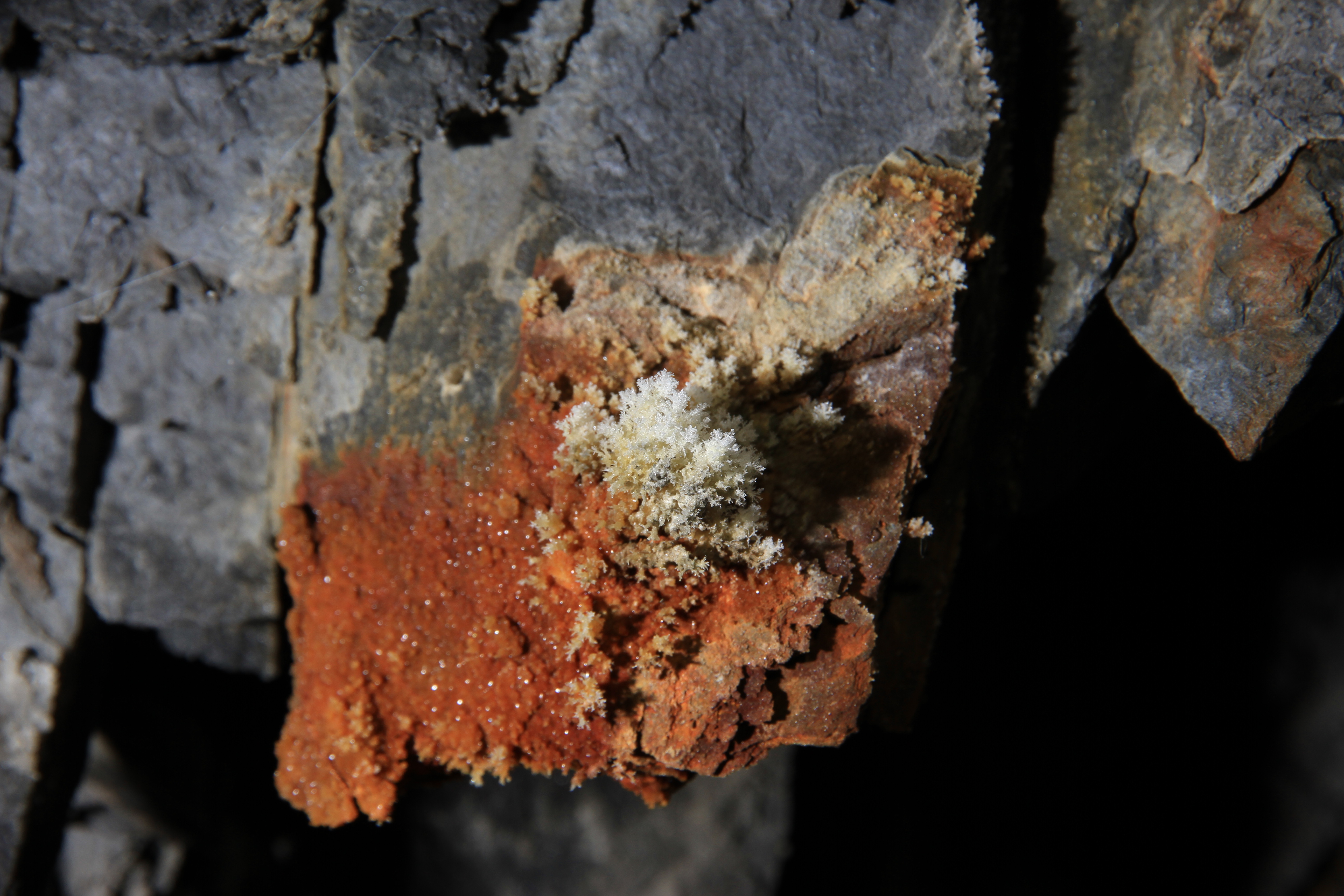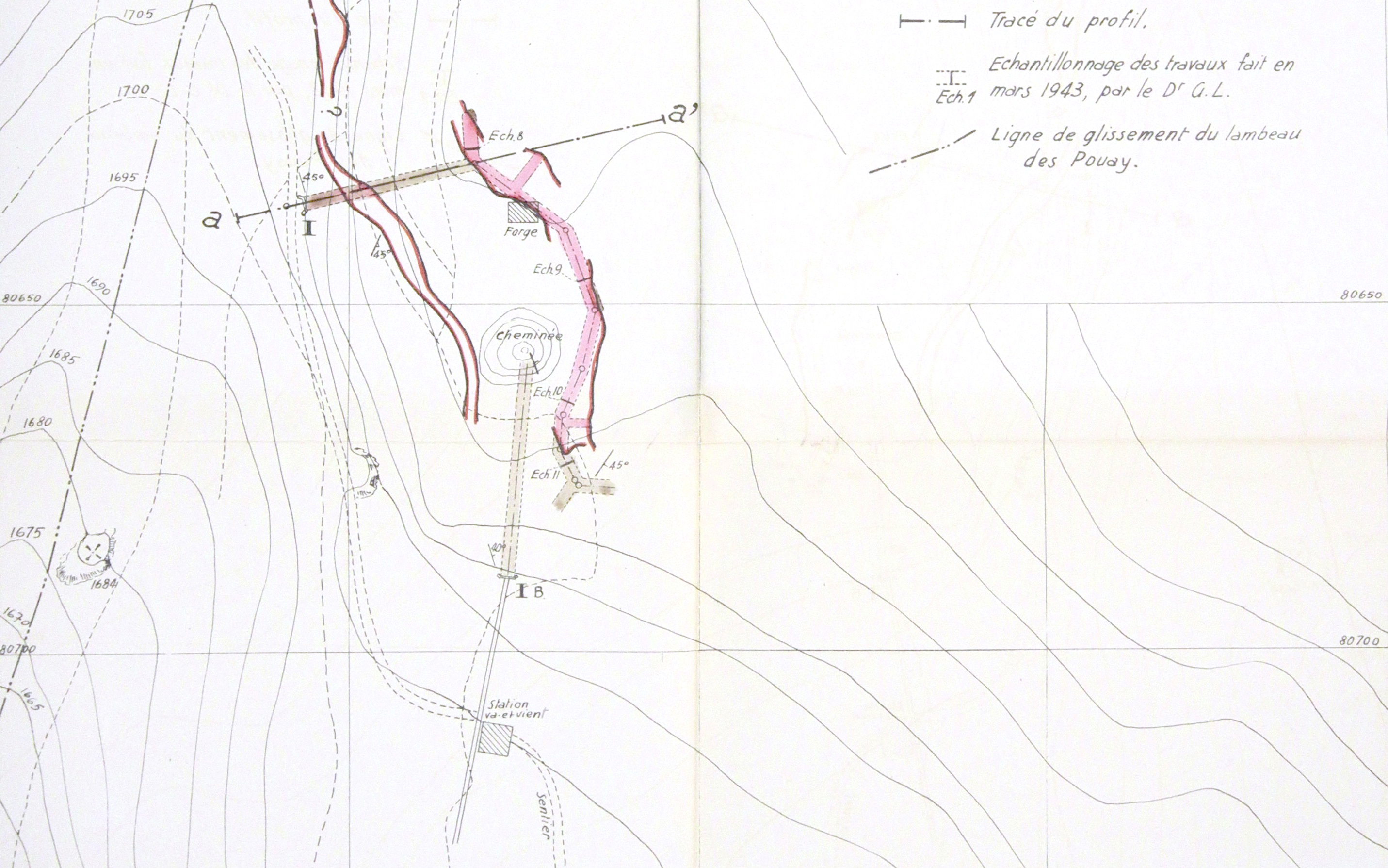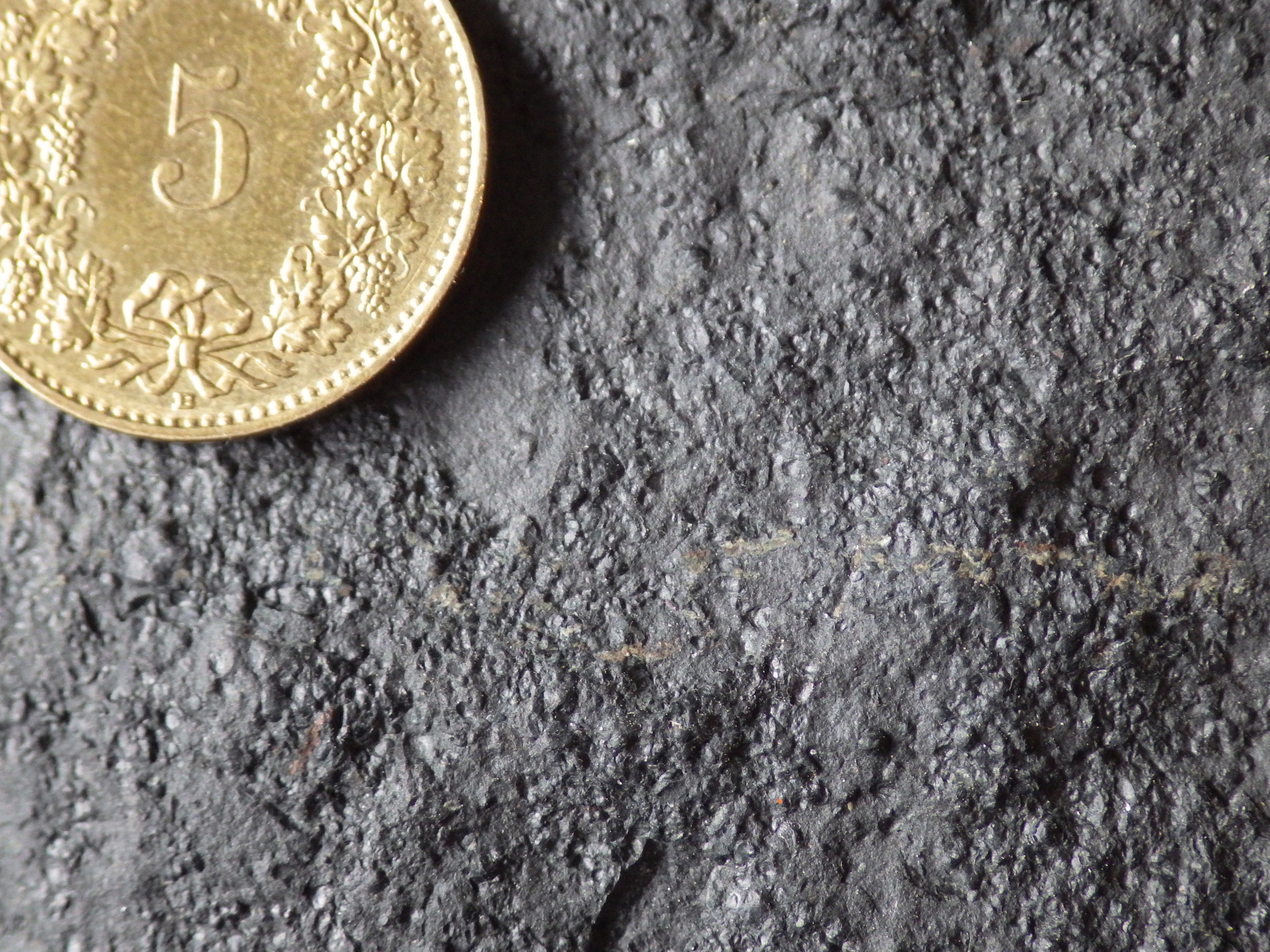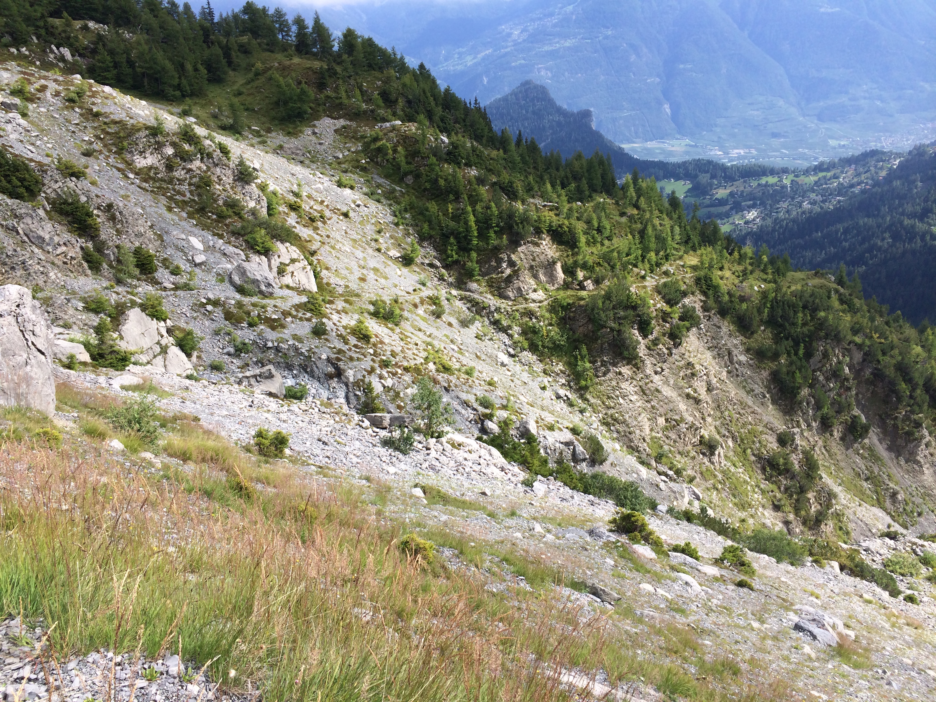 Oben angekommen blieb uns leider immer noch der Blick auf die eindrücklichen Falten der Morcles -Decke verwehrt. Wer hätte gedacht, dass wir so hoch hinaus mussten, um in der Schweiz die Bahamas zu finden? Während sich im Hintergrund die überhitzten Motoren mit leisem Knistern abkühlten, erzählte uns Roger Widmer einige interessante Informationen zur Entstehung der Eisenoolithe von Chamoson. Weshalb wir uns bis hier hinauf bemühen mussten um zu den Bahamas zu gelangen und welche grossen Investitionen die Gesellschaft «Mines de Fer de Chamoson» hier investiert hatte, ohne das es zu einem Abbau kam.