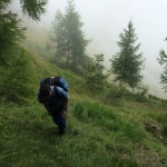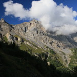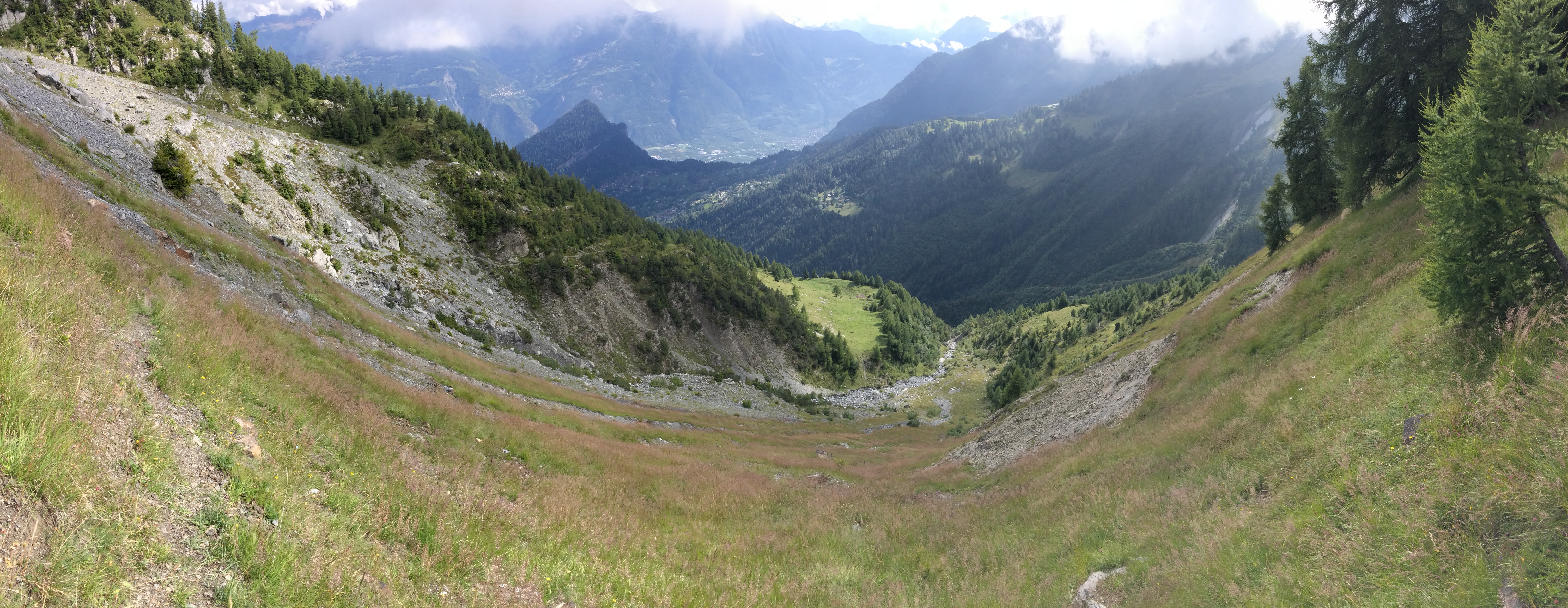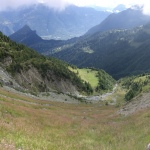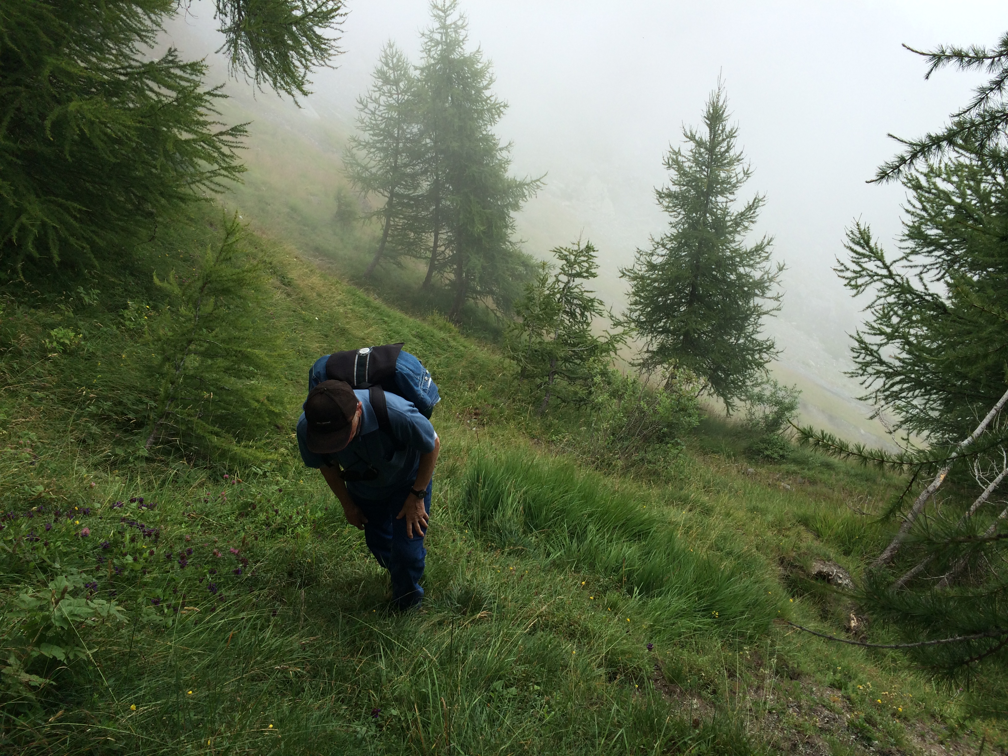 Am Bahnhof von Chamoson angekommen, schien es als hätten sich die Sonnenstrahlen gegen den Regen durchgesetzt. Auf jeden Fall blieb es trocken, aber die Berge waren noch von dichten Wolken und Nebelschwaden verhangen. Zu unserem Glück war es möglich, mit dem Auto bis hinauf zur Alp Chamosentse auf 1908 m zu fahren. Die Fahrt verlief ohne Zwischenfälle, unsere Fahrzeuge mühten sich tapfer den immer steiler und enger werdenden Fahrweg hinauf.