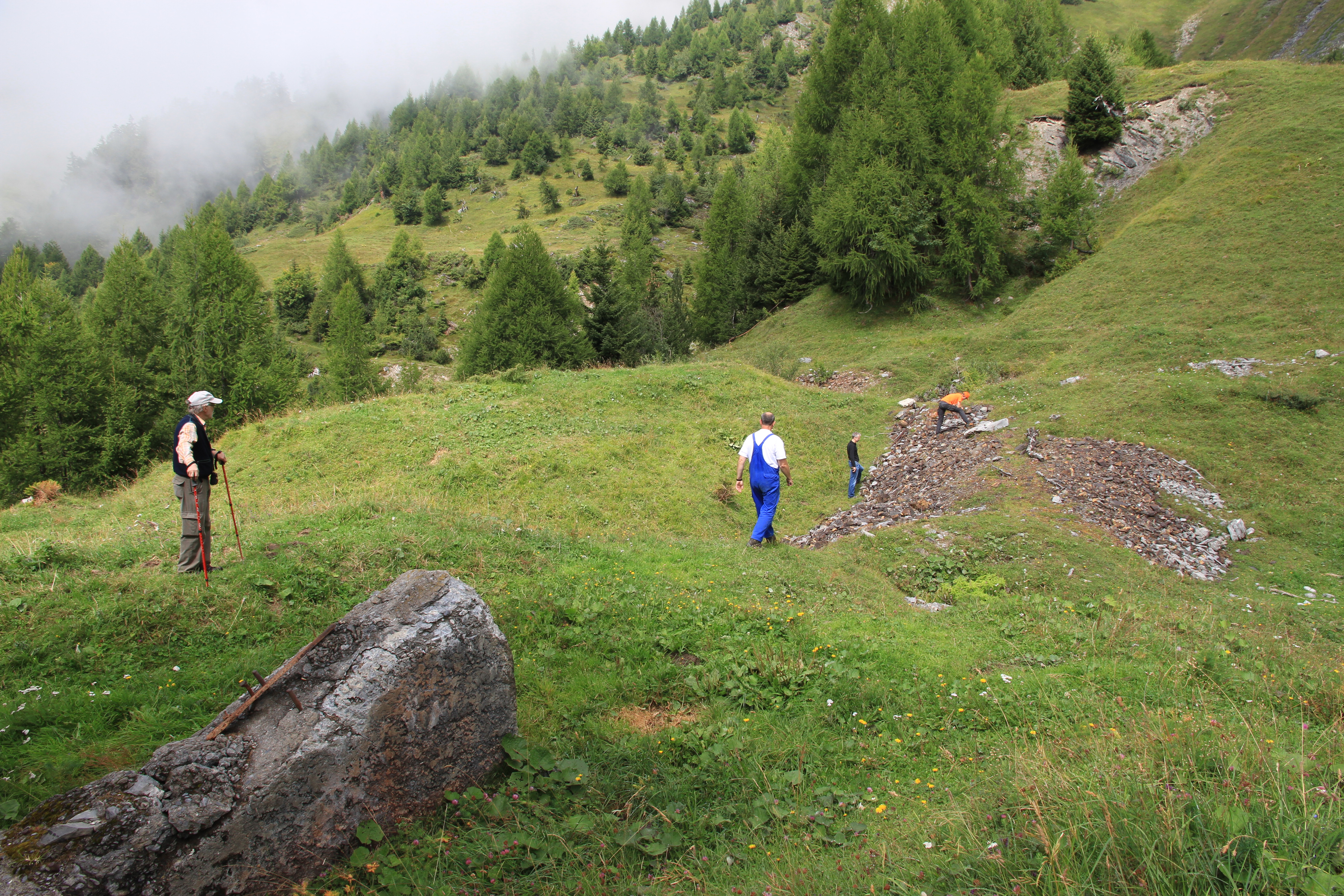 Natürlich waren nun alle Teilnehmer neugierig darauf das Bergwerk und seine letzten Spuren im Gelände zu entdecken. Aber dazu mussten wir zuerst in diesem immer noch sehr dichten Nebel den richtigen Weg 200 m hinunter nach Les Pouays finden. Doch Peter Aeberhard führte uns souverän durch das unwegsame Gelände und so konnten wir nach ca. 200 Höhenmeter und einer halben Stunde Fussmarsch die ersten Ruinen im Gelände erkennen. Schon bald entdeckten wir einzelne Erzklumpen die im Geröll umherlagen. Durch ihre dunkle Farbe unterschieden sie sich sehr gut von den helleren Kalksteinen. Schnell verteilte Lothar ein paar Magnete, um besser die magnetithaltigen Klumpen bestimmen zu können. Ein wahrer «Goldrausch» brach aus und Andren begann schon fleissig den Rucksack zu füllen.