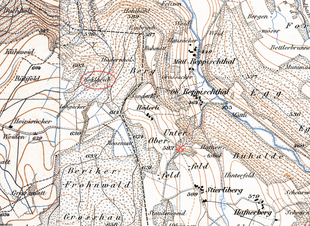 Nach mündlichen Überlieferungen wurde Mitte der vierziger Jahre von einem gewissen Johannes Reutlinger in jenem Tobel wieder gearbeitet. Zu beiden Seiten des Baches soll er gezimmerte Stollen angelegt haben. Die abgebaute Kohle war mit zwei Pferden abtransportiert worden. Dieser Reutlinger erhielt in Aussersihl am 25. Juli 1838 einen Schürfschein für das Reppischtal zwischen Urdorf und Äugst, mit Ausnahme des dem Staate gehörenden Land „Riedhof“. Da er aber zu nahe (54 m) an der Konzessionsgrenze des Bergwerks Riedhof einen Stollen auffuhr und dabei den vorgeschriebenen Abstand von 300 m nicht einhielt, wurden ihm bereits im gleichen Jahr am 28. August 1838 weitere Tätigkeiten untersagt. Bei einer Begehung im Jahr 1899 durch Emil Letsch, konnten ihm Anwohner die Stelle im Tobel noch zeigen. Aber es war bereits alles wieder zusammen- gebrochen. Die mergeligen Abhänge mit dem daraufliegenden Moränenmatierial waren verrutscht und wanderten talwärts (diese Bewegungen sind noch heute zu beobachten). Das begehen der steilen Böschungen war mit grossen Schwierigkeiten verbunden und Letsch konnte sich nur mit Mühe vorstellen, das an diesem Ort einmal Bergbau betrieben worden war. Er hatte alle Schluchten in diesem Gebiet untersucht, aber keine Spur von Kohle gefunden.