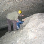 Danach versuchte Jörg, frisch motiviert, noch die Engstelle vom Eingang 3 zum See zu durchkriechen. Doch er blieb nach 5 m stecken. Er harrte an diesem ungastlichen Ort aus, bis ich vom Eingang 2 her, mehr schwimmend als kriechend, bis auf 3 m an in heran gekommen war. So war es uns gelungen die Messstrecke im Hauptstollen zu vervollständigen.