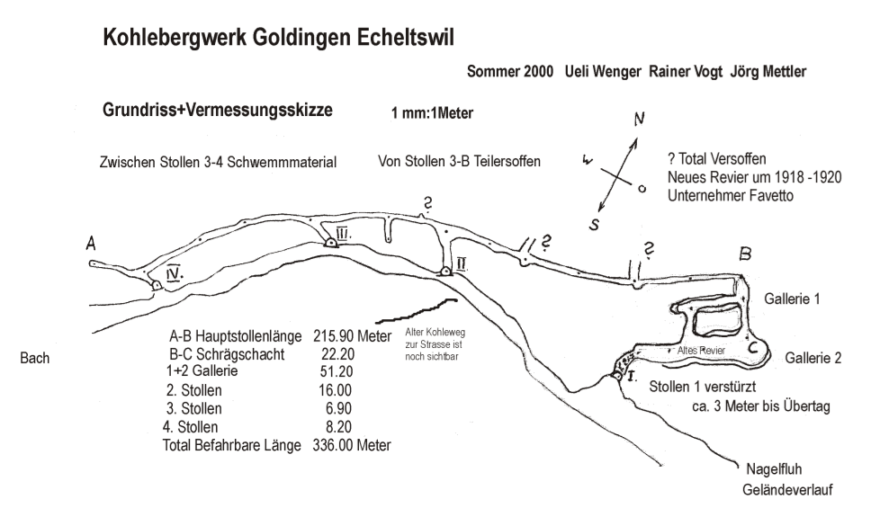 Ich suchte nun den nächsten Stollen, den ich bloss 40 Schritte Bachaufwärts auch fand. Auch da ein kleines Rinnsal, aber der Schuttkegel war kleiner. Aus diesem Grunde war der Eingang offen, der Stollen führte ca. 30 Grad geneigt abwärts. Die Decke bestand aus gesundem Nagelfluh. An der Linken Seite sah ich ein schwaches, 3 bis 6 cm mächtiges Kohlenflözchen. Sechs Meter weiter hinten stand ich an einem glasklaren See, er führte rechtwinklig auf beiden Seiten von meinem Standort weg. Ich wand mich auf der linken Seite oberhalb der Wasserlinie in Richtung des andern Sollens d.h. Bachabwärts. Aber kurz bevor, ich das Tageslicht sehen konnte, verhinderte der oben erwähnte Schuttkegel das Weiterkommen.
