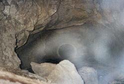 In dieser ungemütlichen Position hatte es nun Jörg auch noch das Karbidlicht ausgetropft! Dadurch war er gezwungen, seinen Rückzug tastend im Dunkeln durchzuführen. Nach 10 Minuten, meine Uhr zeigt 12:35 Uhr an, sassen wir an der Sonne und genossen unseren Essen.
