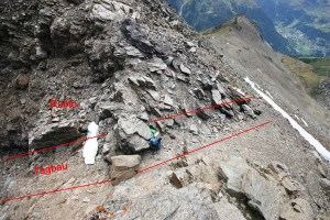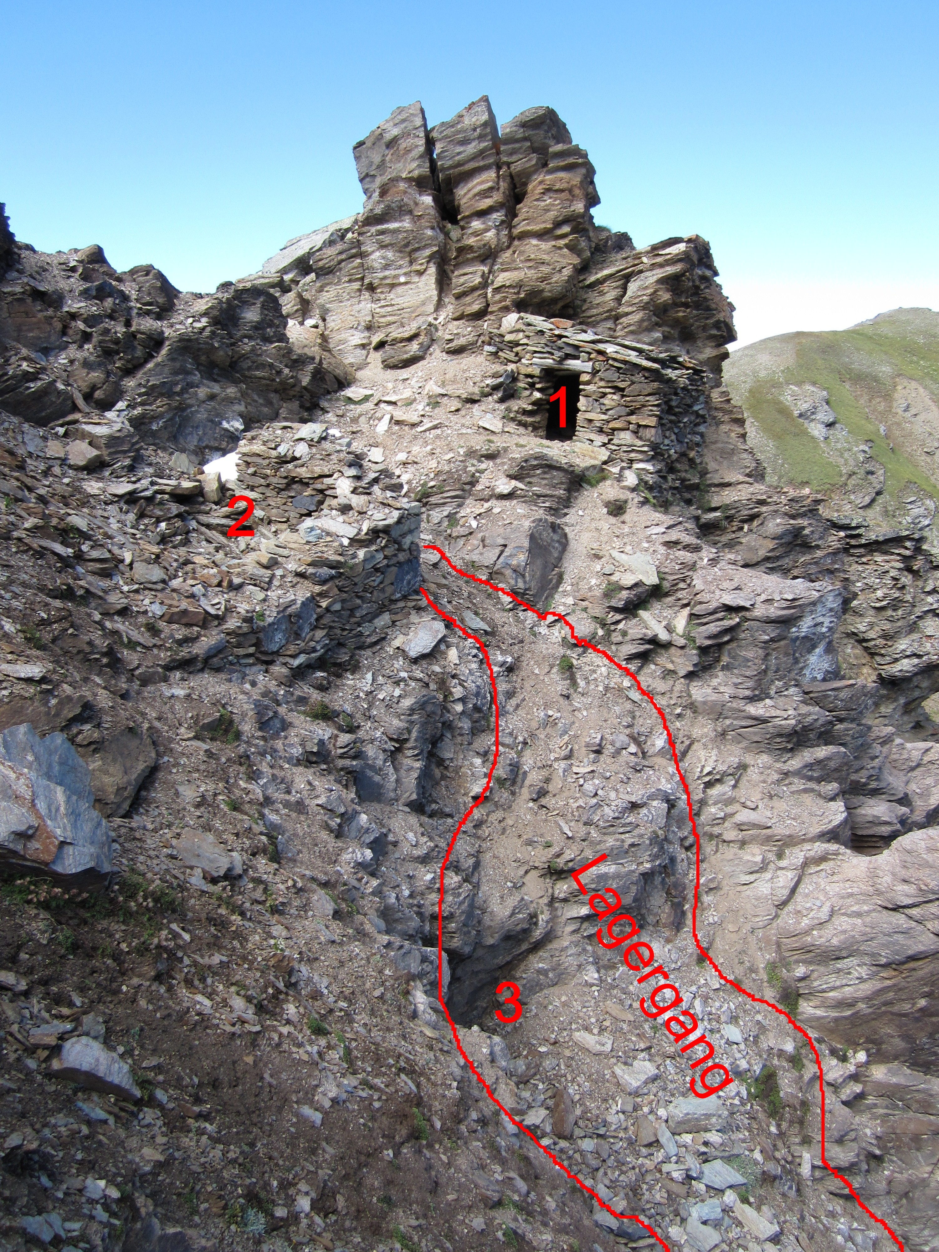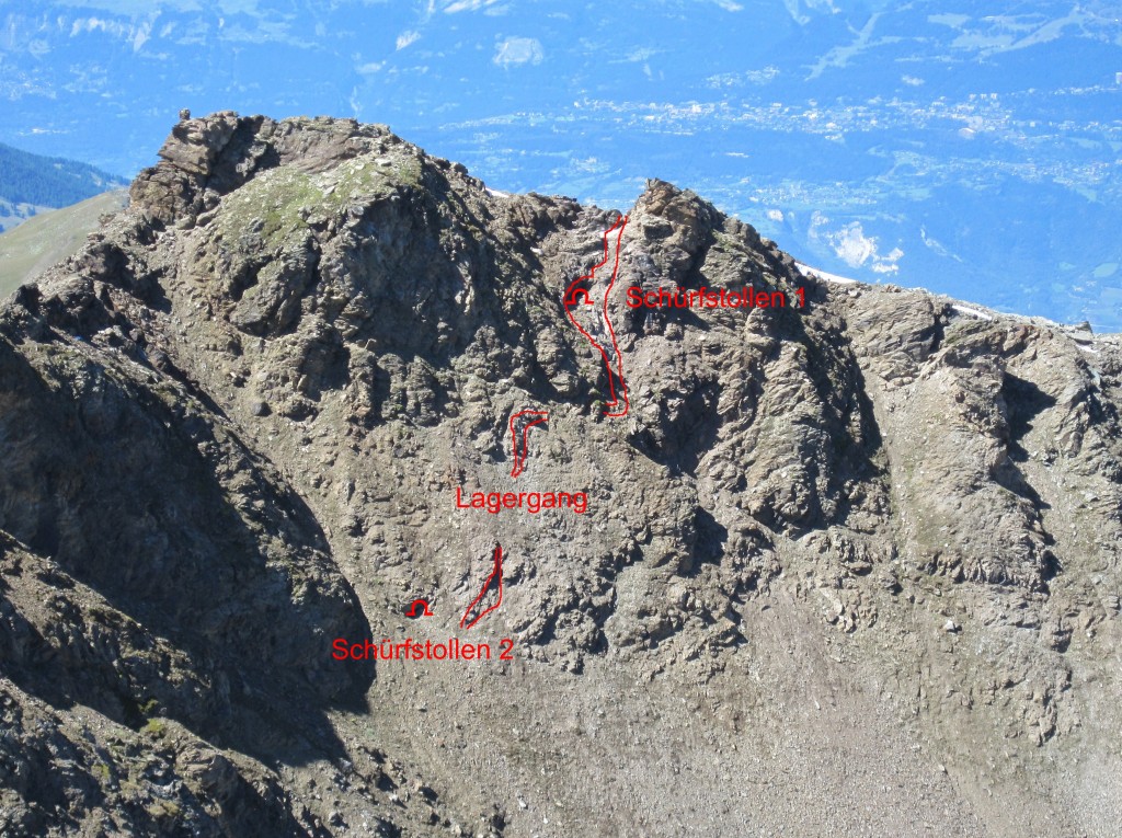 Das Ni-Co Vorkommen Plantorin befindet sich auf einer Höhe von 3000 m am Grat zwischen Turtmann- und Val d’Anniviers nördlich des Omen Rosso. Man findet an der Stelle des alten Lagerganges noch die Reste von 3 alten Gemäuern, wovon das eine Gemäuer auf der Ostseites des Grates noch recht gut erhalten ist,das Dach im Winter 2010 aber leider Schaden nahm, so dass die Hütte vom Zerfall bedroht ist. Der früher Erzführende Gang besteht hauptsächlich aus Baryt, Braunspath und Quarz. Dort wo der Gang die Gratline schneidet beträgt seine Mächtigkeit ca. 3 m. Unterhalb in Richtung Osten vergrössert er sich auf 5 m Mächtigkeit, um danach ca. 15 m unterhalb der Gratlinie auf 50 – 80 cm zu schrumpfen. Bei meiner Befahrung der Abbaustelle konnte ich keine Spuren von Ni-Co finden, nicht einmal die geringste Spur von Kobaltblüten. Auch im kleinen Stollen, welcher an der Stelle mit der grössten Mächtigkeit in den Baryt vorgetrieben wurde, konnte ich keine Spuren einer Vererzung finden. Auf der östlichen Seite des Grates am Steilhang gegen das Frilitäli kann der Gang noch ca. 60 m weiter, bis zu einem zweiten, verstürzten Stollenmundloch, verfolgt werden. Auf der westlichen Seite sieht man noch gut die Reste des nun verstürzten 5 m langen Tagbauschlitzes.