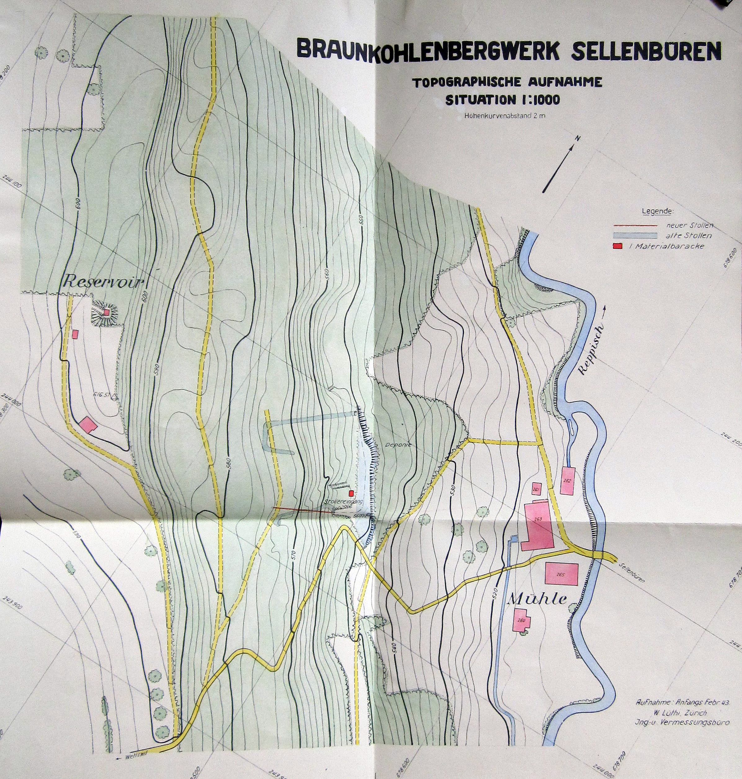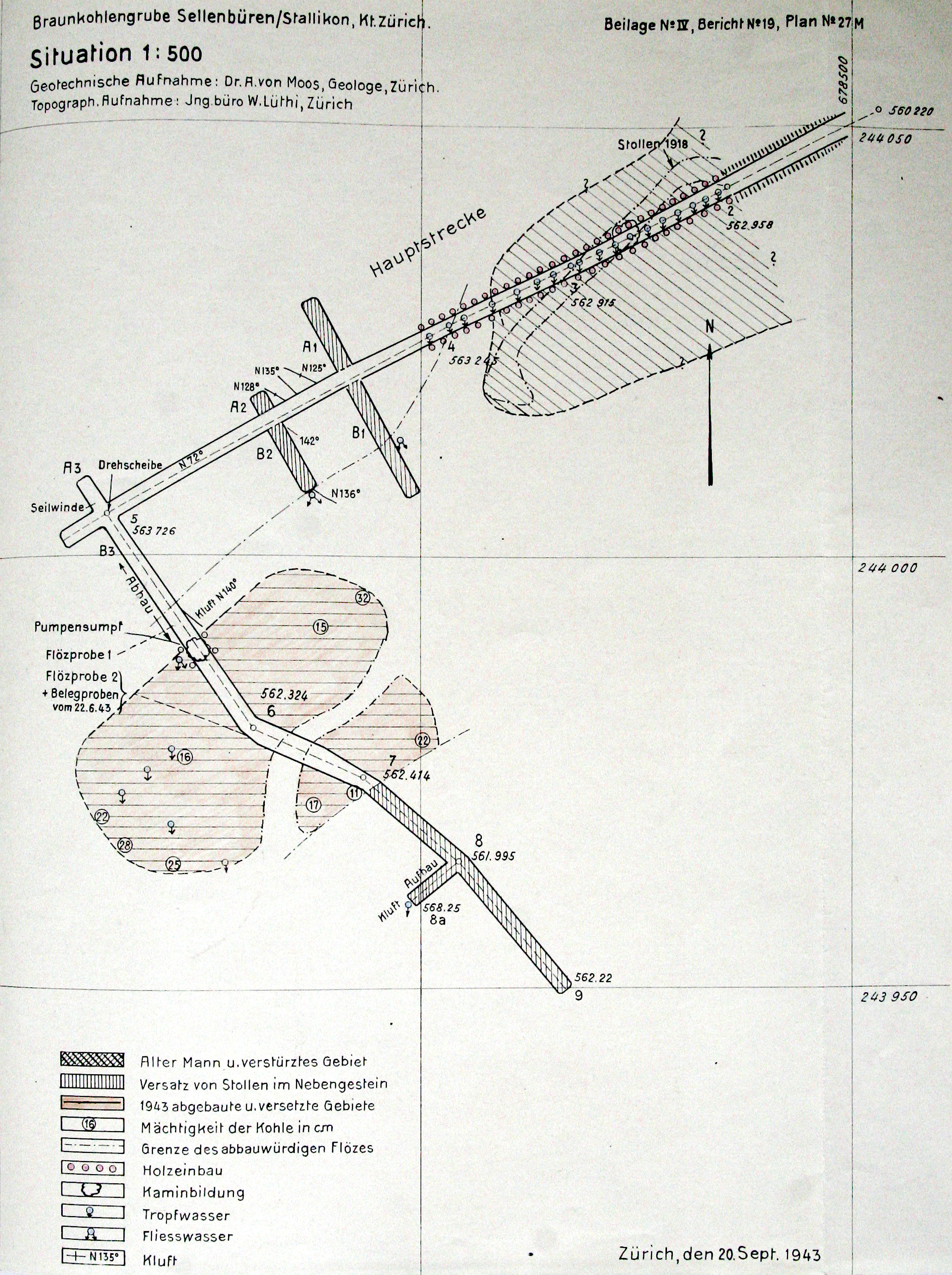 Trotz dieser Vorsichtsmassnahmen trat schon bald wieder reichlich Tropf- und Fliesswasser auf. Aus diesem Grund wurde am unteren Ende des Abhaus ein Pumpensumpf erstellt, um die tiefer liegenden Stollen anfallenden Wassermassen abzuleiten. Zu dieser Zeit wurden die Vorschläge gemacht, mangels guter Aufschlüsse im Gebiet der Mine von Sellenbüren einige Schürfschlitze anzulegen und auf der linken Talseite des Reppischtales zwischen Mühleberg und Hüsli eine Anzahl von kurzen Bohrungen auszuführen. Ab dem 28. April 1943 wurde der Kompressor, welcher links vom Stollenmundloch in einer Baracke aufgestellt wurde, elektrisch betrieben. Am 29. April 1943 erreichte man mit dem neuen Querschlag B3 nach ca. 19 m die Randzone des Flözes. Nach dem Punkt 7 steig das Flöz unter auskeilen der Kohle wieder an und verschwand nach einer Störung. Bei der Begehung der Grube am 22.Juni 1943 betrug die Länge der Stollen 90 m streichende Strecke (Hauptstollen) und 70 m Querschlag.Nach dem Auskeilen des Flözes wurde der restliche Stollen bis zum Punkt 9 in tauben Sandstein vorgetrieben, ohne eine Spur von Kohle anzutreffen. Um festzustellen, wieweit die dem Flöz entsprechenden bituminösen Mergel über den Vortriebaufstiegen, wurde bei Punkt 8 ein Aufhau angesetzt. Dieser traf bei einer Höhe von 568.25 m (6.255 m über der Sohle des Querschlags B3) die bituminösen Mergel und den typischen grauen und Wasserführenden Mergel an, der wieder Tropfwasser brachte. Damit war aber festgestellt worden, dass das Kohlenvorkommen von Sellenbüren nur eine beschränkte Ausdehnung hatte. Es war ein muldenförmig gelagertes Kohlenflöz erschlossen worden, das im Querschlag 27 m Breiten-Ausdehnung besass.Verschiedene Anzeichen deuteten laut A. von Moos darauf hin, dass man sich am Rand des Flözgebietes befand und dass die Ausdehnungsmöglichkeiten für einen Bergbau sehr beschränkt waren. Sehr nachteilig wirkte sich auch der starke Wasserandrang auf einen regulären Abbau aus. Das Wasser trat immer aus dem über der Kohle anstehenden, klüftigen Mergel, sobald dieser angefahren wurde. Auch für die Deponie war am steilen Hang vor dem Stollen wenig Platz. Der in der damaligen Zeit anfallende Berg wurde bereits auf der früheren Schutthalde gelagert. Bei einer weiteren Fortsetzung der Arbeiten musste dafür eine andere Lösung gesucht werden. Nach dem die vorgerichtete Kohle abgebaut wurde, und man die Sondierung in Richtung SW aufgeben musste, wurden alle Geleise und ein Teil der Einbauten aus den Stollen entfernt. Da es Probleme mit der alten Wasserfassung für die Mühle gegeben hatte, wurde zwischen dem Punkt 4 und den Querschlägen A1 und B1 eine Lehmmauer zur Stauung des Wassers eingebaut. Danach wurden die Arbeiten Ende Juli 1943, d.h. nach 8½ Monaten wieder eingestellt.