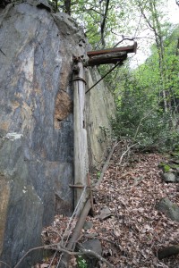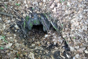Etwas Höher: Zweite Galerie, 1892 neu angefahren (Manz), südöstlich der Bachrunse an ungünstiger Stelle, direkt unter der Halde der dritten Galerie. Nur 10 cm Anthrazit links (südlich) neben dem Stollen; Fallen 45° SE.